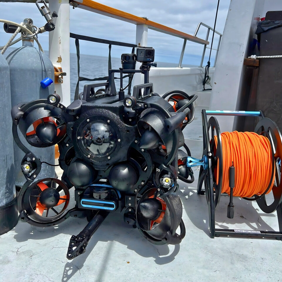 To assist in locating a rare, dark-colored Mako shark, Oceanbotics deployed its professional-grade SRV-8X ROV. The vehicle was piloted down to a depth of 1,640 feet (500 meters) by ROV operator Ryan Gates using only a handheld controller and a laptop, demonstrating the system’s simplicity and effectiveness even in demanding underwater conditions.