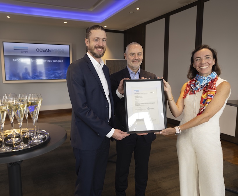 OceanWings’ automated wingsail propulsion system has received a Type Approval Design Certificate (TADC) from DNV, confirming its compliance with strict safety, reliability, and performance standards and supporting its readiness for integration on commercial vessels